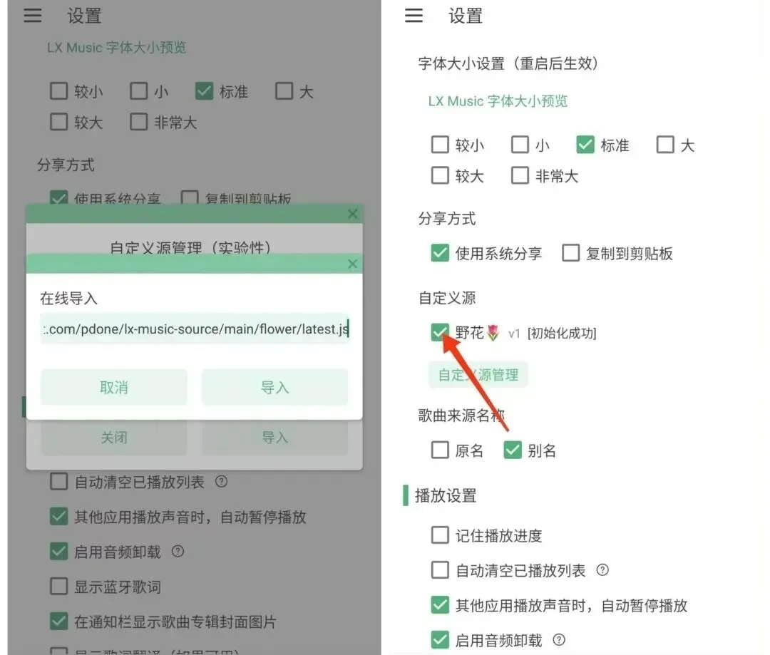 音源导入教程:打开设置找到【自定义源管理】→选择【在线导入】→粘贴音源链接(附专属音源)→导入完成后勾选该音源,显示初始化成功即可正常使用!