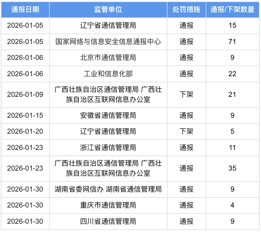 通过研究监管通报,可以了解监管机构对App的关注重点和执法尺度,从而判断自己的App是否存在类似的问题,及时进行整改。史宾格平台监控到国家网络与信息安全信息通报中心、工信部、2家地方网信及9家地方通信管理局公开通报/下架共计220款(包括Android App 187款、iOS App 6款、小程序 26款、Android SDK 1款),其中通报194款(包括Android App 166款、iOS App 6款、小程序 26款、Android SDK 1款),下架26款(包括Android App 26款)