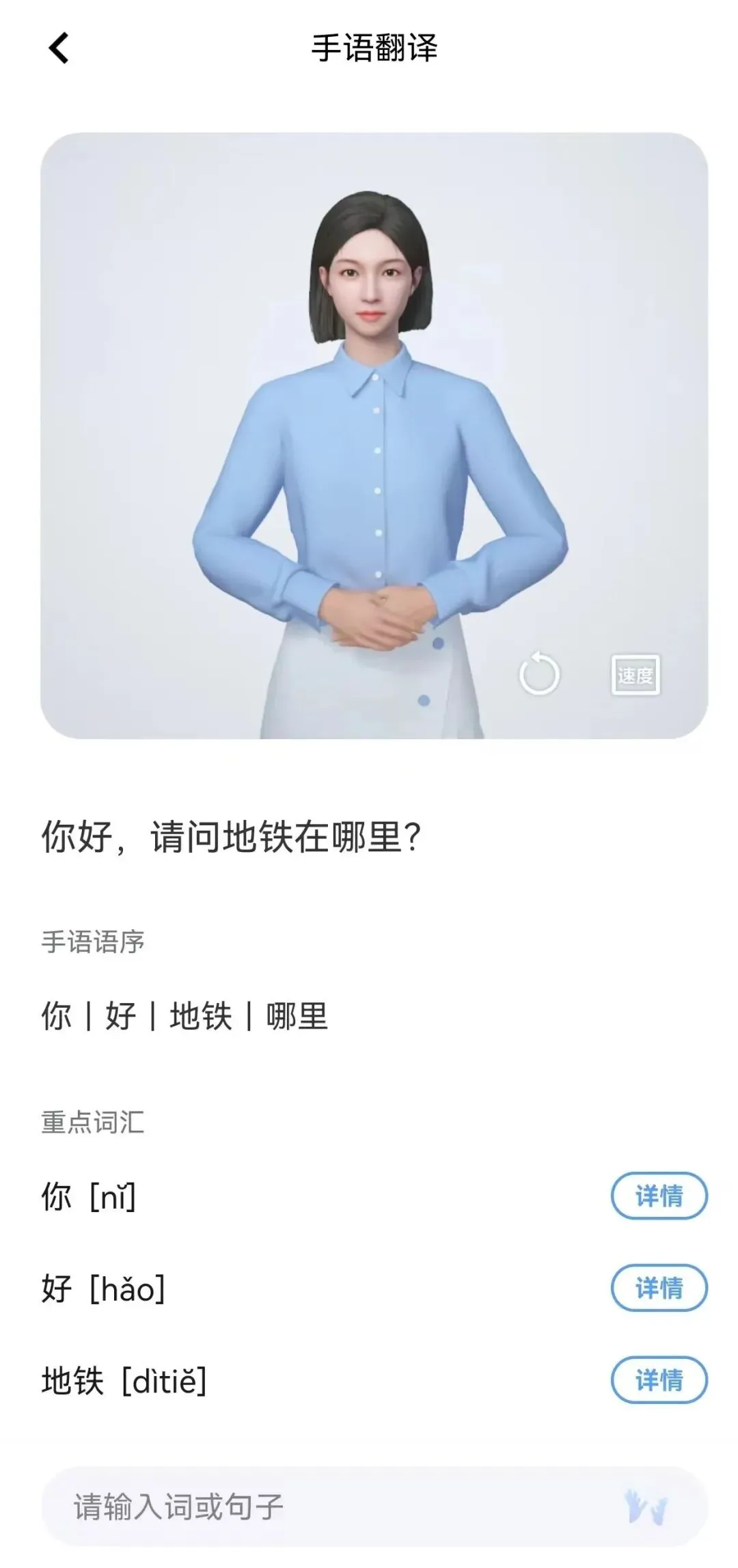 亲测不止是用于交流,也可以用来手语学习!输入自己想学的句子,会自动拆解成正确的手语语序,并附上各个词详情教学画面,个人觉得是目前市面上所有数字人手语APP中做的最好的一款,虽然是数字人但是面部表情挺丰富拟人的,没有像其他数字人一样僵硬不自然,给这个数字人的自然程度狠狠点赞o( ̄▽ ̄)d