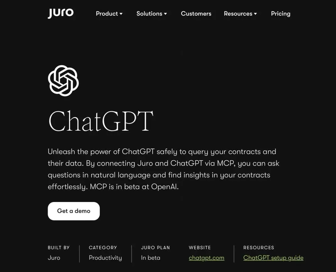 早在 2025 年 10 月,智能合同平台 Juro 就推出 ChatGPT 的 MCP 接口,而且明确引导客户直接在 ChatGPT 中处理合同相关的问题——而非打开 Juro 自家的产品界面。