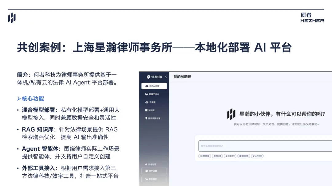 “何者 AI 智能中台”是何者科技研发的一款 AI 平台,支持模型私有云部署(即算力在云端且客户专用)和本地化部署(即算力在本地),并提供针对本地小模型的 RAG 能力,以及一系列经过市场验证的智能体(如“脱敏”)。