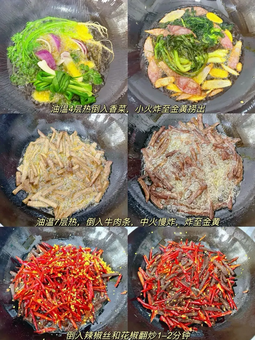 起锅烧油,油温4成热时,倒入香菜、洋葱和生姜,小火炸至金黄后捞出料渣。油温升至7成热,倒入腌好的牛肉条,中火慢炸,炸到牛肉表面金黄、微微发干后盛出控油。转小火,倒入辣椒丝和花椒翻炒1到2分钟炒出香味。