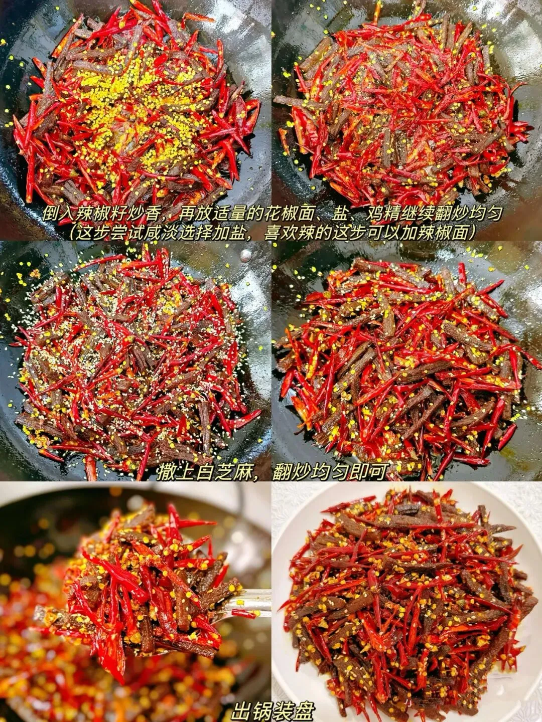 倒入牛肉条和辣椒一起翻炒,加入花椒面、盐、鸡精继续翻炒均匀,口味淡可以不再加盐,嗜辣可以再加一些辣椒面增添辣味。最后撒上白芝麻,翻炒均匀就可以关火出锅。
