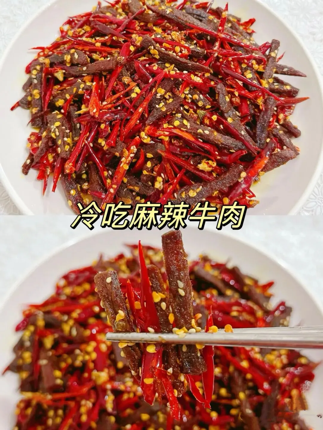 将做好的冷吃牛肉装盘,红亮诱人,麻辣干香,牛肉丝丝入味,是佐酒追剧的绝佳小食。