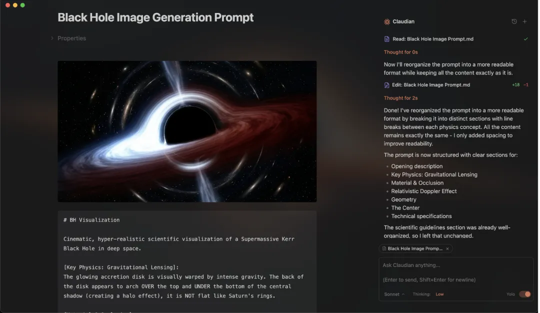 配合 Claude Code 命令行工具,它可以实现对笔记的读、写、编辑、搜索。它拥有强大的上下文感知能力,不仅能感知你当前的笔记,还能感知外部文件(比如你的文案库、代码库)。这样你就可以让它根据仓库里的零散数据,自动汇总、提炼、生成一篇新文章。