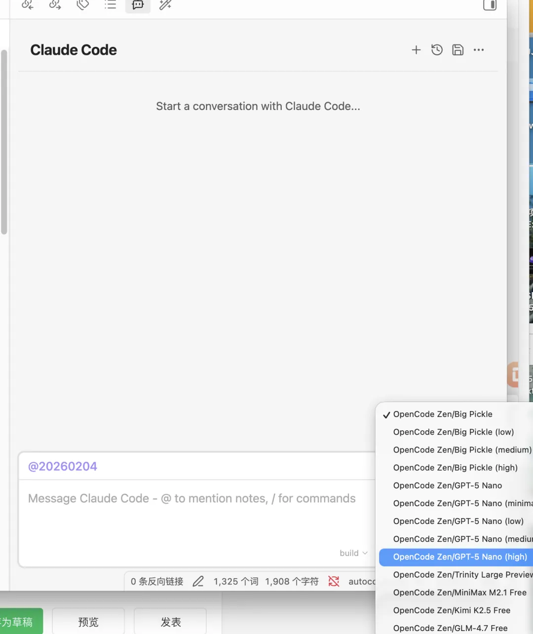 比如我演示的这里,用的就是 OpenCode 自带的免费模型。无需填写 API Key,只需要把 OpenCode 的路径填进插件,参数写上 acp,就能白嫖强大的 AI 辅助功能啦!既省时又省力。