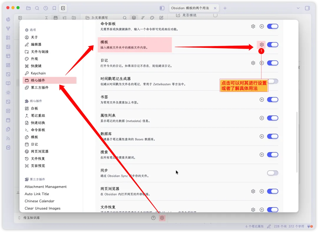 在使用模板前,我们首先需要开启 Obsidian 的这个核心插件。在设置中,找到「核心插件」,然后开启「模板」的开关。模板中,官方也内置了使用说明,感兴趣去学习。