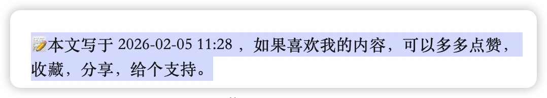 📝本文写于 2026-02-05 11:28 ,如果喜欢我的内容,可以多多点赞,收藏,分享,给个支持。