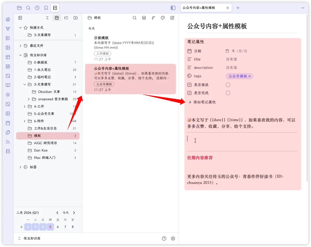 所以我在我的 Obsidian 中创建了一个文件夹,名为「模板」,模板中只保存我的常用模板。文件夹下我创建了一个名为「公众号内容+属性模板」的 md 文档,并且配置好了所需的笔记属性和公众号开头、结尾的固定内容。