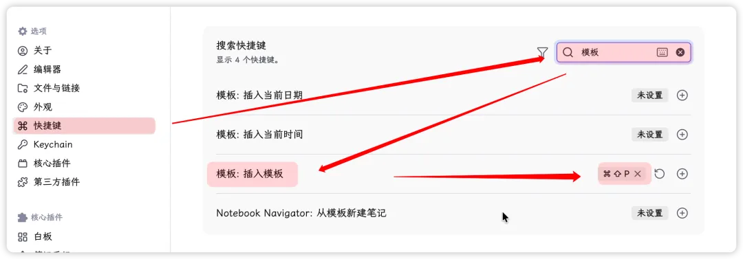 这样,每次使用时,我只需存创建好笔记,然后在笔记中通过快捷键⌘+P,选择所需模板,即可在开始写内容前完成笔记属性和笔记固定内容的自动创建。当然,还可以更进一步,在 Obsidian 中的快捷键中,设置快捷键,如我的快捷键为⌘+⇧+P,即可直接调出来模板的快捷菜单,选择所需模板。