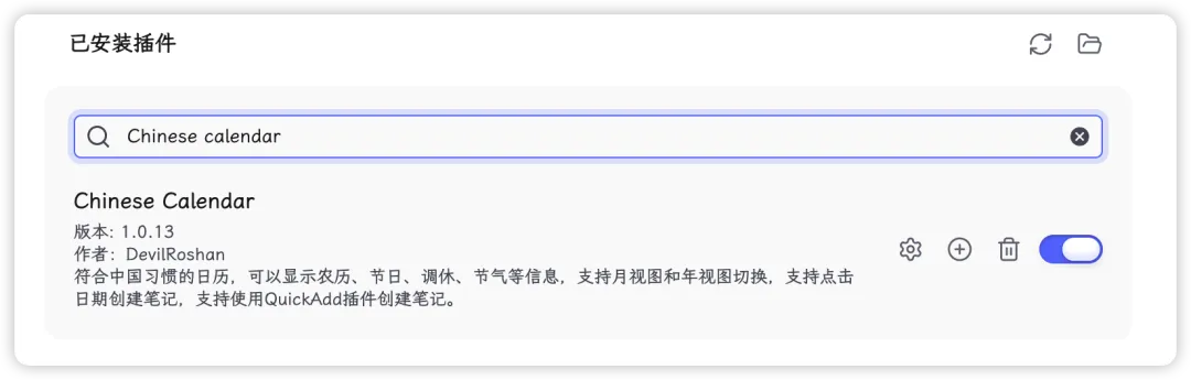 首先,下载并启用日历插件 我用的是「Chinese calendar」,因为他对农历支持更有好,而且支持点击具体的日期,创建当前的日记。