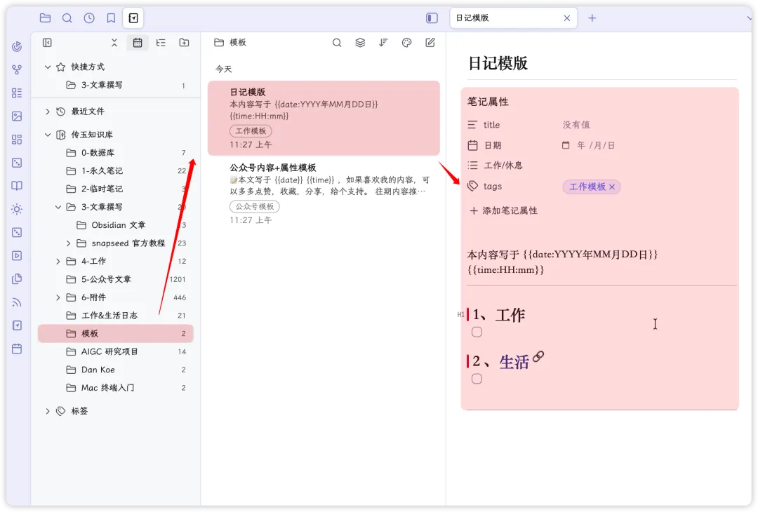 日记模板位置:选择「模板」中的日记模板;