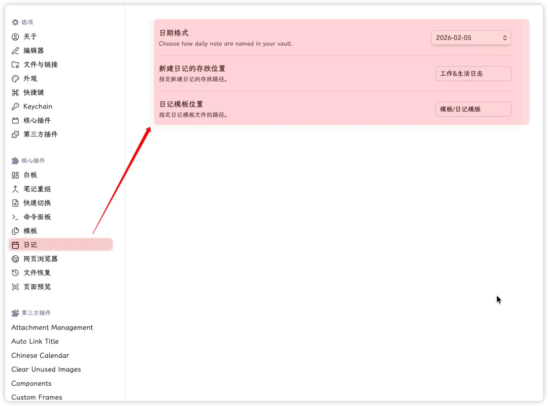 在核心插件-日记设置菜单中(上图),我们可以选择配置三个设置: