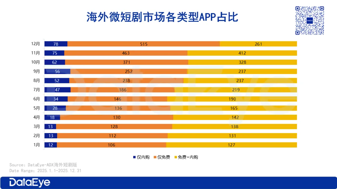 截至2025年12月,海外免费类微短剧APP占比超60%,与1月时形成鲜明对比。