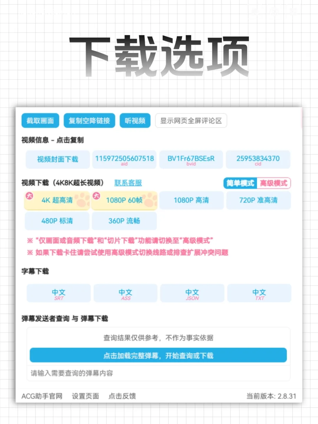 ACG助手是一款浏览器插件,可选择下载的清晰度,如果你是大会员就能下载视频的最高画质,还可以单独下载视频封面、字幕、弹幕等。