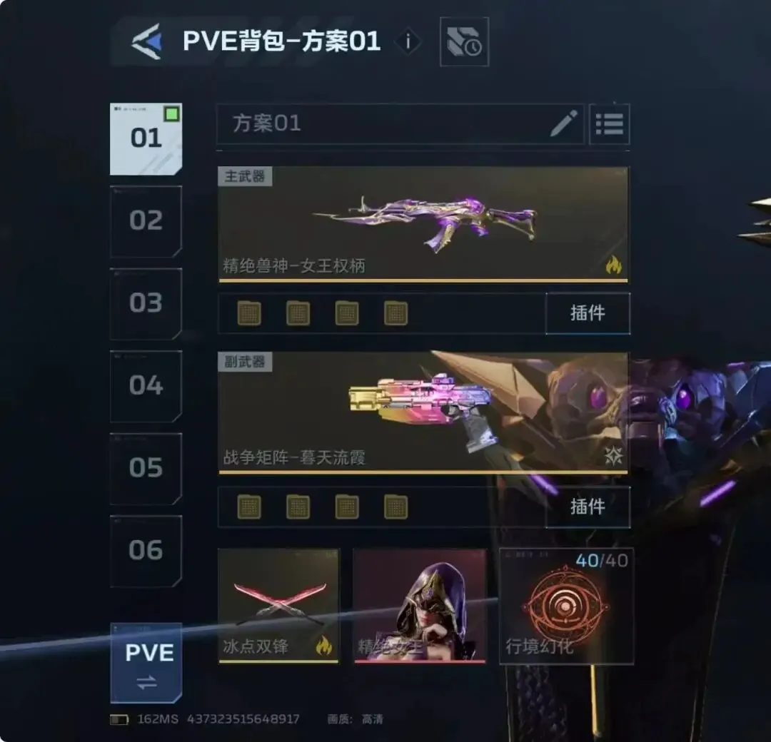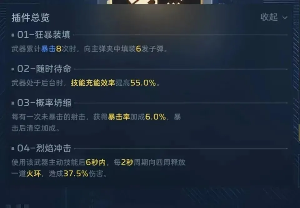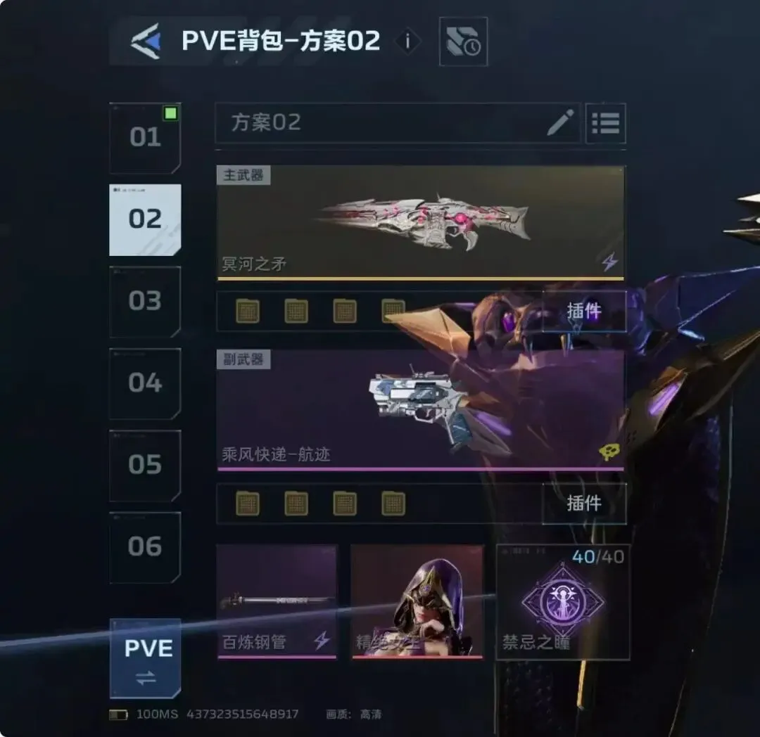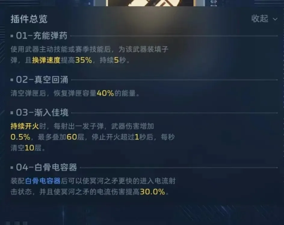 另外一把武器,冥河之矛,副武器经典乘风快递,和纯白基本上共用一套插件了,因为冥河之矛在经历几轮削弱后,现在靠自动回能已经很慢了,而冥河之矛又太吃技能,没技能的冥河不如纯白,所以这里2号插件和纯白是有区别的,冥河之矛得2号要带真空回涌,不要无限续子弹,要等到打空子弹,触发换单动作,并且能量已经涨了之后,直接用乘风技能打断换弹动作,继续输出,一定要打空子弹并且能量恢复之后在使用乘风,这样的话,基本上21秒就能充能完成,21秒一个大,另外就是4号要带专插,