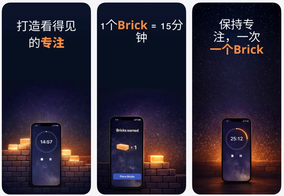 • 简介:一款可视化专注力训练工具,每完成15分钟专注即收获一块砖,亲手筑起你的进步之墙。