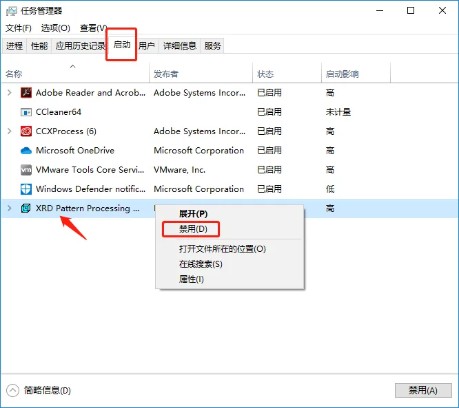 20.软件安装完成后,默认设置是开机启动,可操作取消开机自动启动软件。打开任务管理器,点击左下角的“详细信息”,点击“启动”,找到“XRD……”,右击点击“禁用”,即可取消开机自动启动。