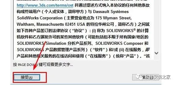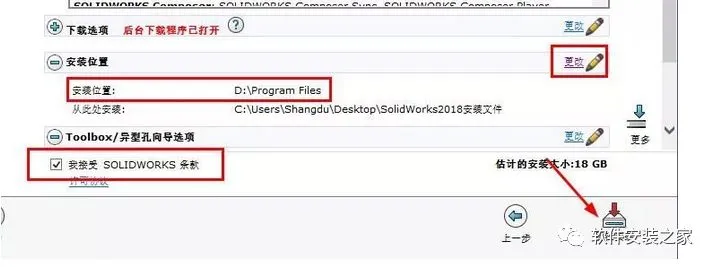 17.首先点击“更改”选择安装路径,我这里安装到D盘,用户可以根据自己实际情况安装到相应的盘(文件较大,不建议安装到C盘),然后勾选“我接受solidworks条款”,点击“现在安装”。