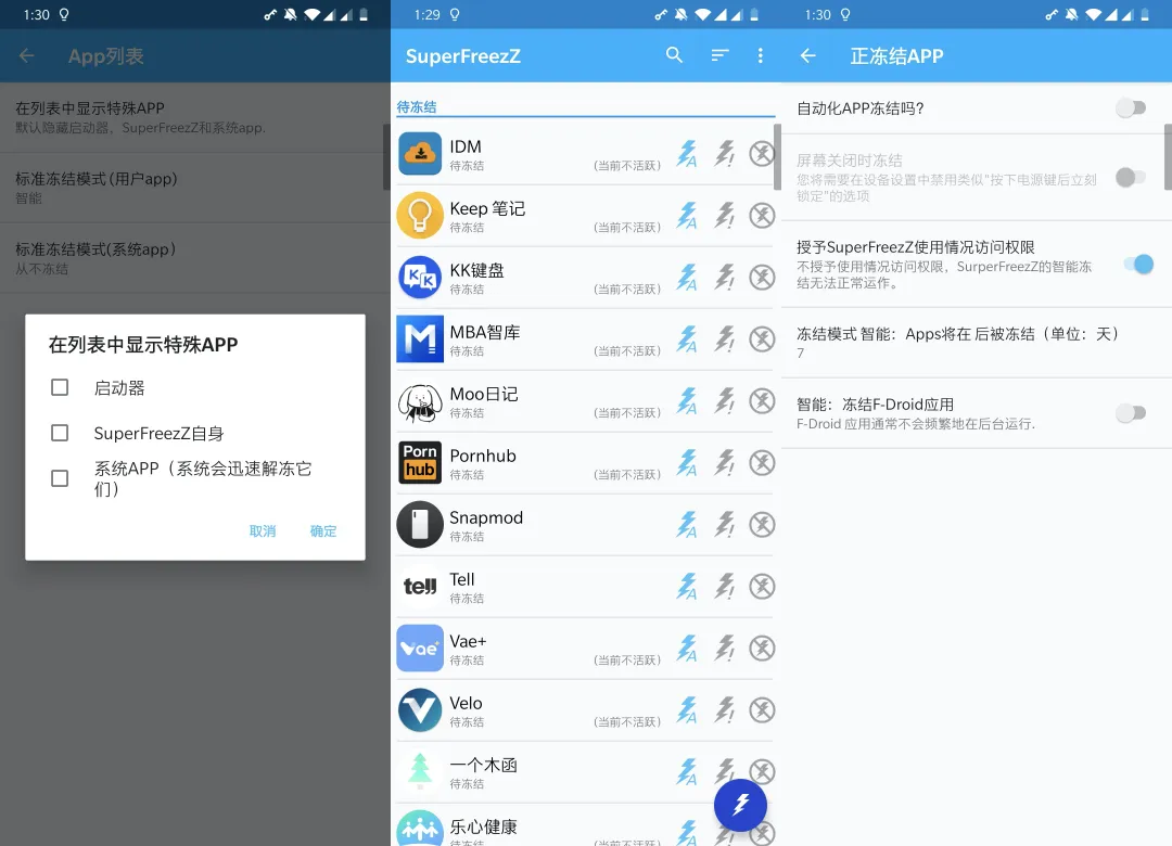 它还有三种冻结模式,可以给每个App 设置,强制冻结,永不冻结或者智能终结。这个智能冻结会根据你使用APP的习惯,如果7 天没有使用就会自动冻结。