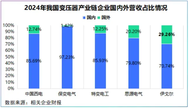 特变电工、思源电气、伊戈尔国内市场虽占大头,但海外营收占比可达20%以上,海外均有不俗的表现。