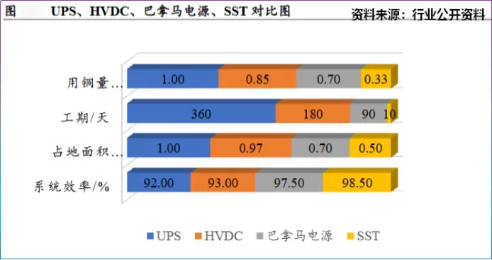 巴拿马电源、固态变压器是现阶段数据中心重要的用电方案,从系统效率上看,SST(98.5%)>巴拿马电源(97.5%)>传统HDVC(93%)。