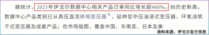 12月,公司成功斩获得克萨斯州多个大型数据中心的环氧浇筑干式变压器订单,年内数据中心相关产品订单同比增长超400%,创下新纪录。