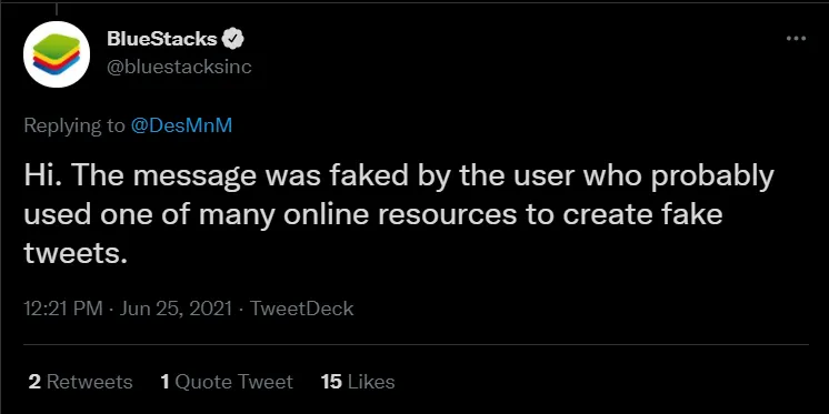 但经葡萄君求证后,BlueStacks似乎并没有发表过那一条推文,这可能是某个网友的恶作剧。而且蓝叠官方也很高兴微软推出了这一功能,并希望在未来做出更好的模拟器。
