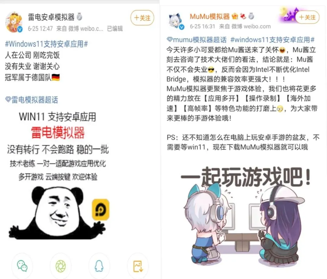 在得知Win11支持安卓应用后,国内的一些网友感叹道:安卓模拟器厂商恐怕是要转型,甚至倒闭了。但部分安卓模拟器的厂商也表示:不会失业,反而会做出更强大的安卓模拟器。