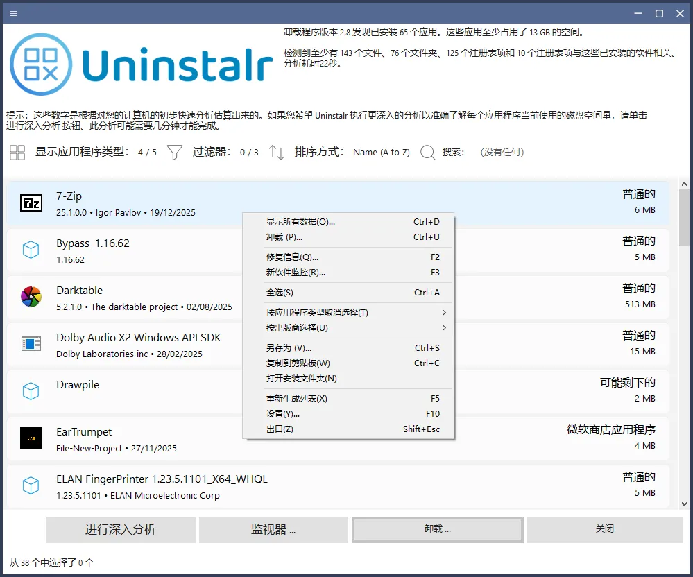 功能:一款轻量且易上手的Windows软件卸载工具,专注于提供更准确、更彻底的卸载体验。主界面以清晰的列表形式展示系统中所有已安装应用,支持搜索、排序与筛选,方便快速定位目标程序,并可实时显示每个应用占用的磁盘空间,数据来源于实际扫描而非系统自带的不准确信息。支持同时卸载多个应用,具备强大的无人值守批量卸载能力,卸载开始后无需任何人工干预,即使目标程序本身不支持静默卸载也能顺利完成。内置自定义卸载引擎,可识别并处理多种类型的应用,最大程度清理残留文件与注册表项,适合需要高效整理系统、释放空间的朋友。