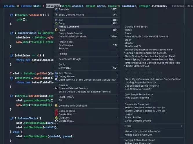 但是每次需要输入很长一段命令,有些命令遗忘的话,还要去翻看Arthas的命令文档,然后还要复制代码中类或方法的全路径,很是不方便。而这款arthas的插件就可以让你完全摆脱这些苦恼。生产力大大提升。