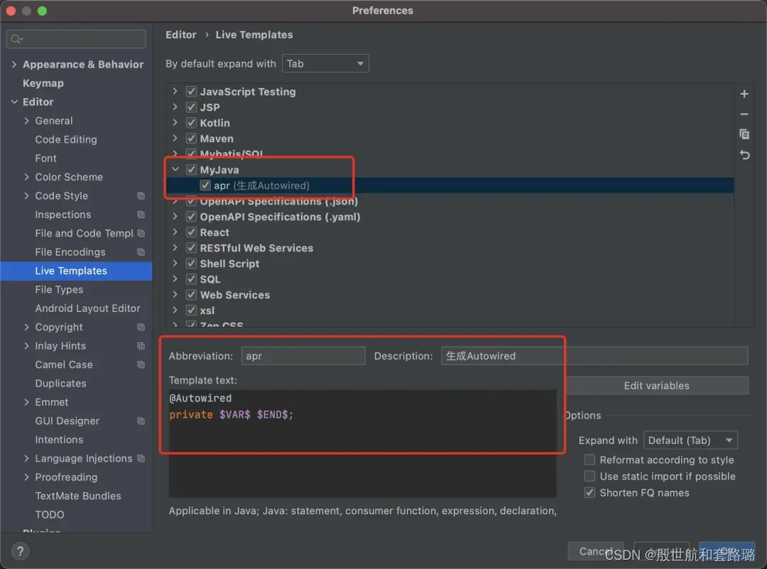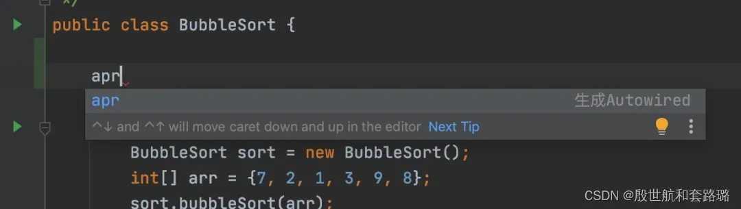 只要输入apr ,就能自动提示,并且生成Autowired 语句了。可以根据自己的代码习惯,自定义一些代码模板,帮助我们快速写代码。