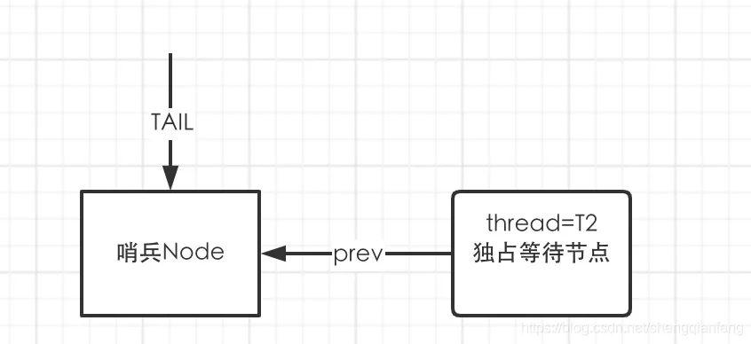 继续for循环,tail就不为空了,tail赋值给t也不为空,就是初始化的那个节点。将其赋值给T2独占等待状态节点的prev节点。