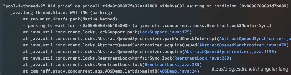 T2线程阻塞在LockSupport.park方法。通过调用jstack方法可以观察到此时的线程stack信息: