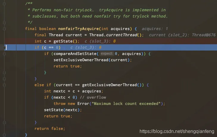 final boolean nonfairTryAcquire(int acquires) { final Thread current = Thread.currentThread(); int c = getState(); if (c == 0) { if (compareAndSetState(0, acquires)) { setExclusiveOwnerThread(current); return true; } } else if (current == getExclusiveOwnerThread()) { int nextc = c + acquires; if (nextc < 0) // overflow throw new Error("Maximum lock count exceeded"); setState(nextc); return true; } return false; }