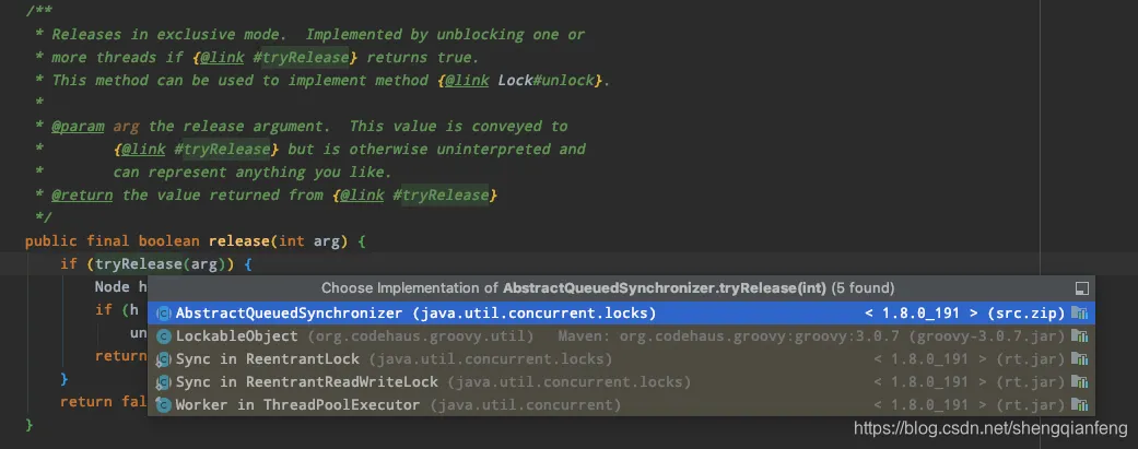 同样是调用了AQS的release方法,其中可以看到tryRelease这个方法,这个方法是ReentranLock提供的。