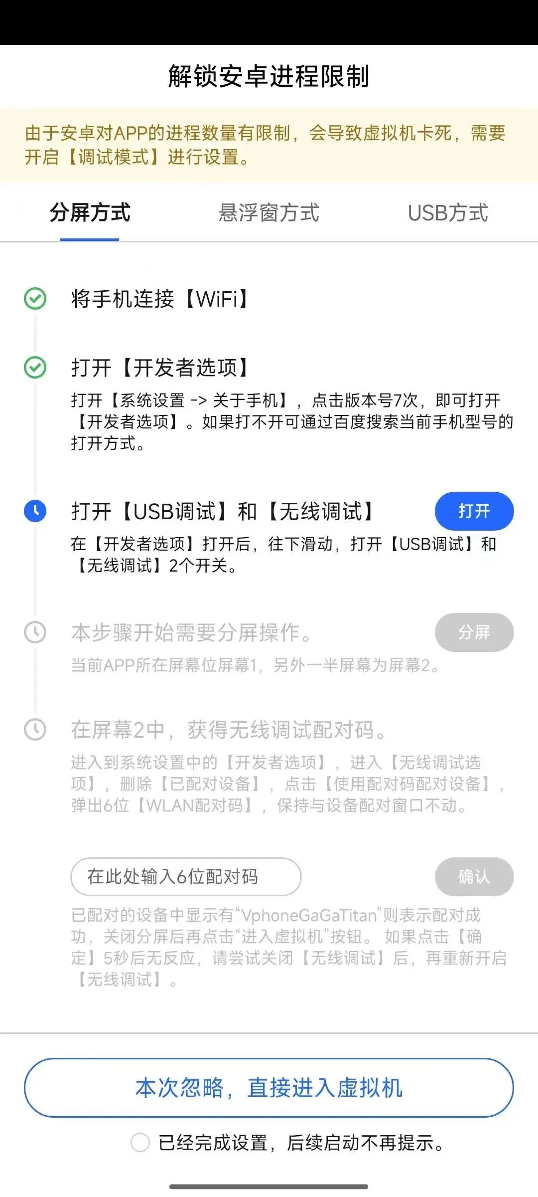 第一次进入有一个“解锁安卓进程限制”的页面,如果完全不懂ADB连接的可暂时忽略这个,点击“本次忽略,直接进入虚拟机”