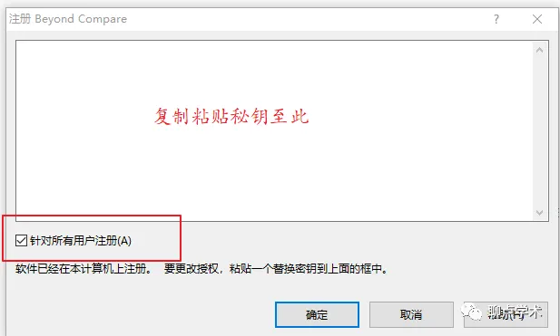 破解方法1:打开软件,点击“输入秘钥”,弹出如下对话框,然后将小编给你准备的BC注册码全选、复制、粘贴到图中空白处,记住勾选“针对所有用户注册”,然后点击确定,等待软件响应“注册成功”。
