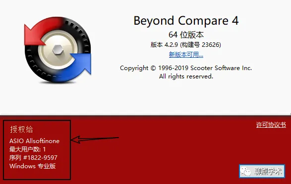 完全退出BC软件,重启BC。点击“帮助”,点击“关于Beyond Compare(A)”弹出页面显示如下,即说明破解成功。