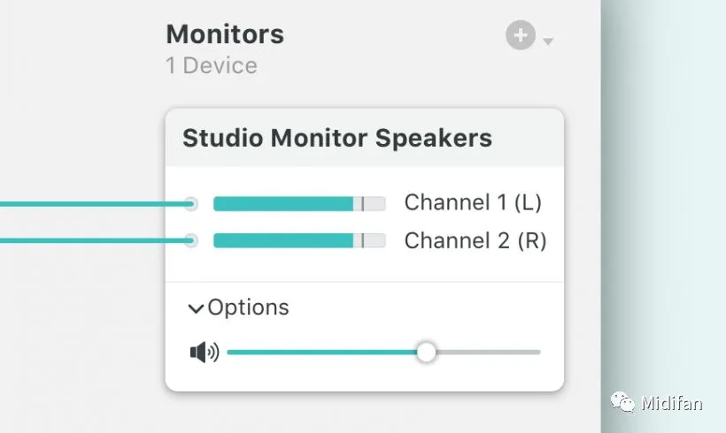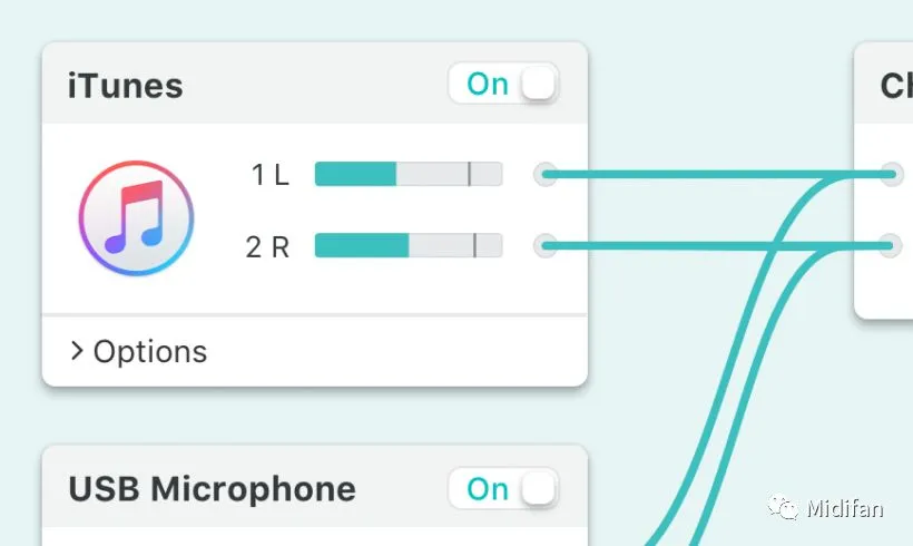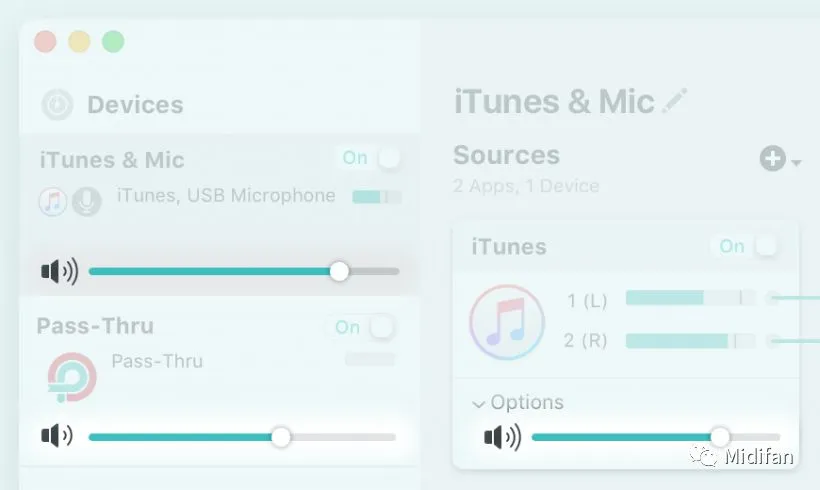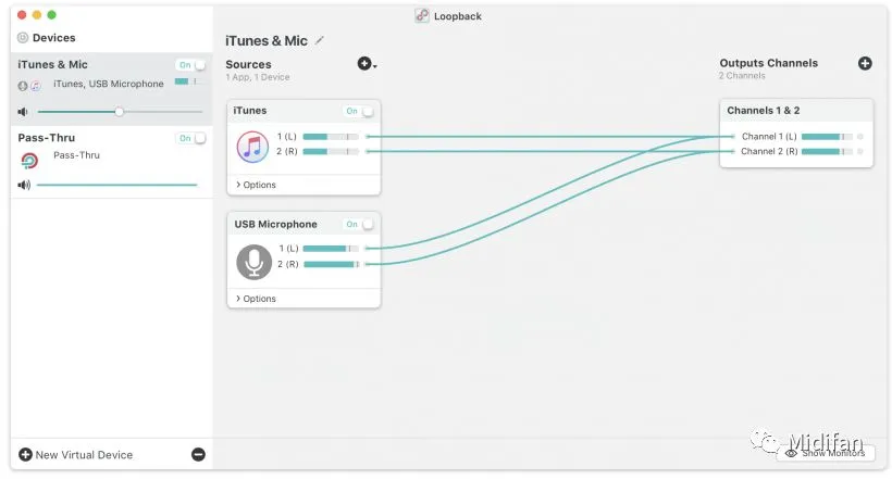 在Loopback 2上你可以直接看到每个设备,然后直接自由连接。而且每个设备都可以看到立体声的音量控制推子直接调节。而且你可以直接将监听设备连接到音频通路里的任何一个设备,来监听每个环节的具体声音。