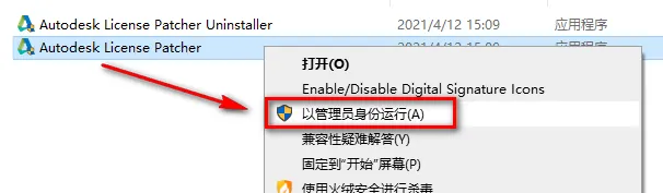 9.选中Autodesk License Patcher,鼠标右键选择“以管理员身份运行”
