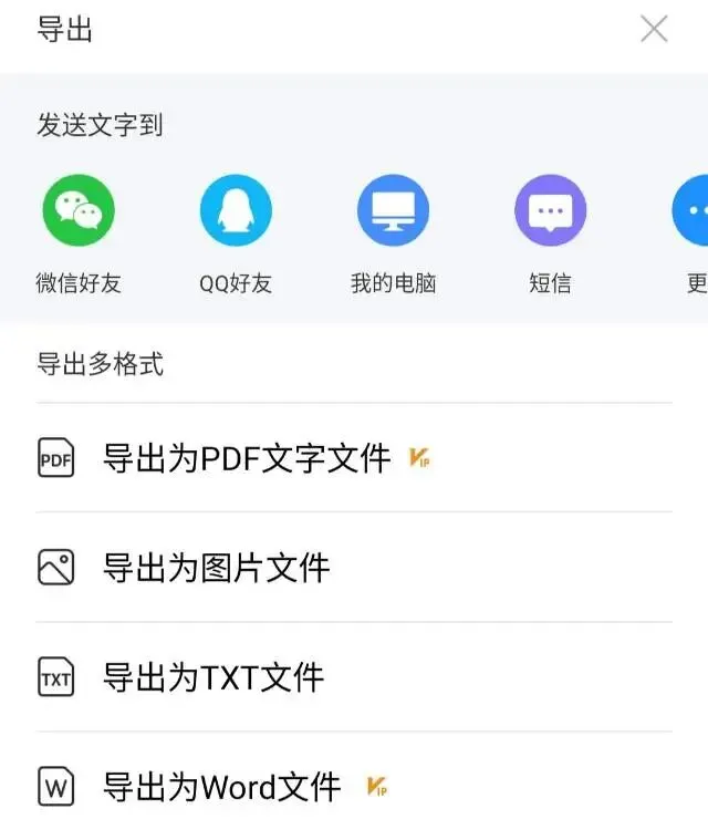 识别后就是导出文件了,因为软件已经破解VIP功能,所以支持导出PDF、图片、txt、word文件!或者直接发送到微信或QQ,很是方便