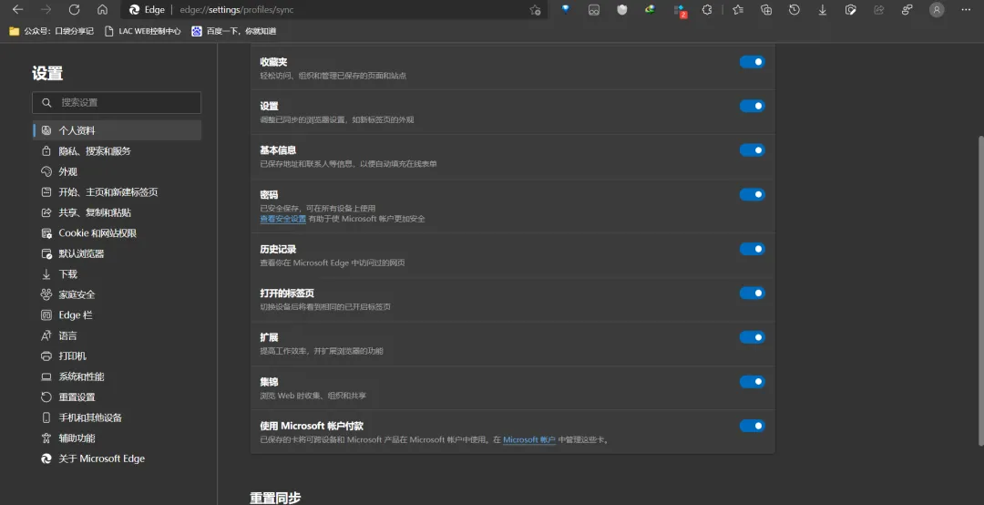 在同步界面,它可以同步你的 收藏夹,设置,基本信息,密码,历史记录,打开的标签,扩展,集锦,使用 Microsoft 账户付款