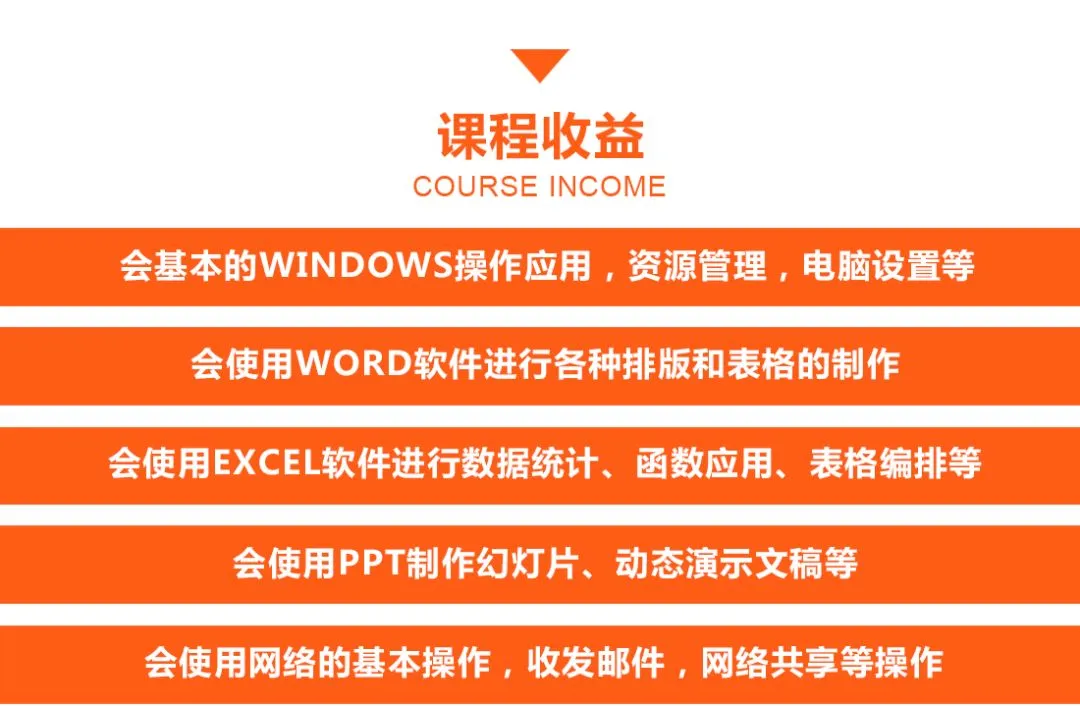 针对零起点想学习计算机的人群、对于办公有需求的白领办公人员、希望对计算机有进一步掌握的人员等。主要学习软件指法、打字、Word、Excel、Powerpoint。学后可进行相关日常文件处理。包括在办公室日常处置一些文件,收发邮件,查找材料,聊天工具运用,电子商务,常用办公设备的运用等。