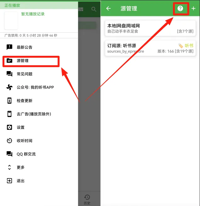 选择「源管理」,在「源管理」界面选择右上角的「?」号
