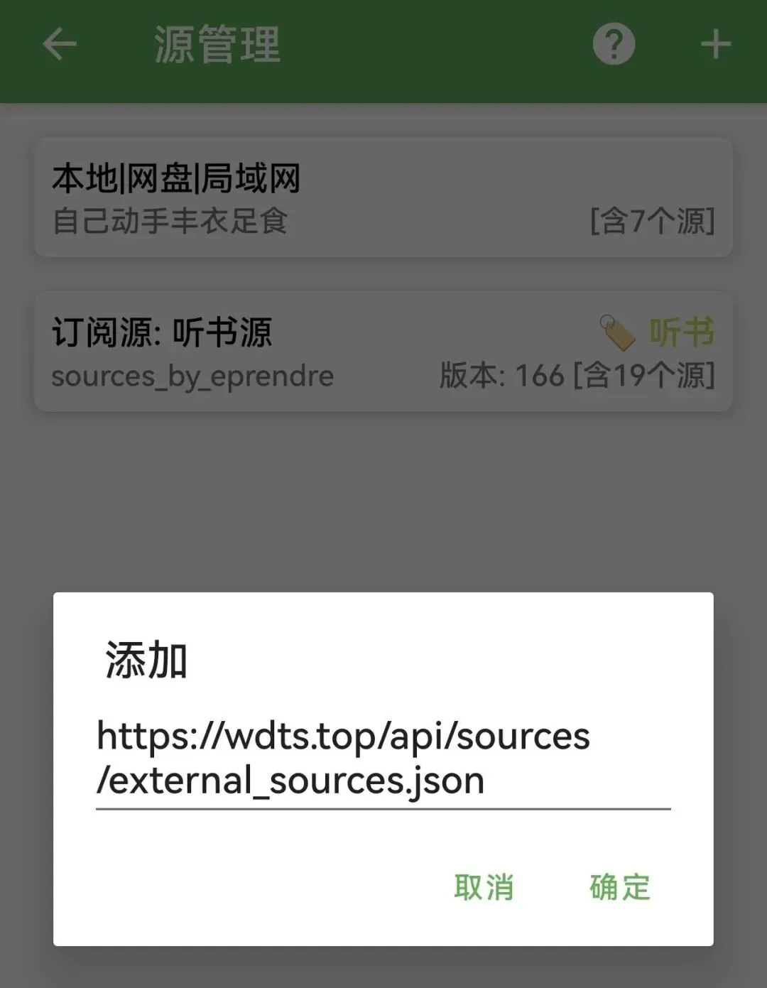 回到「源管理」界面,选择右上角「+」号,就可以自动粘贴链接,这一步直接点击「确定」加载即可
