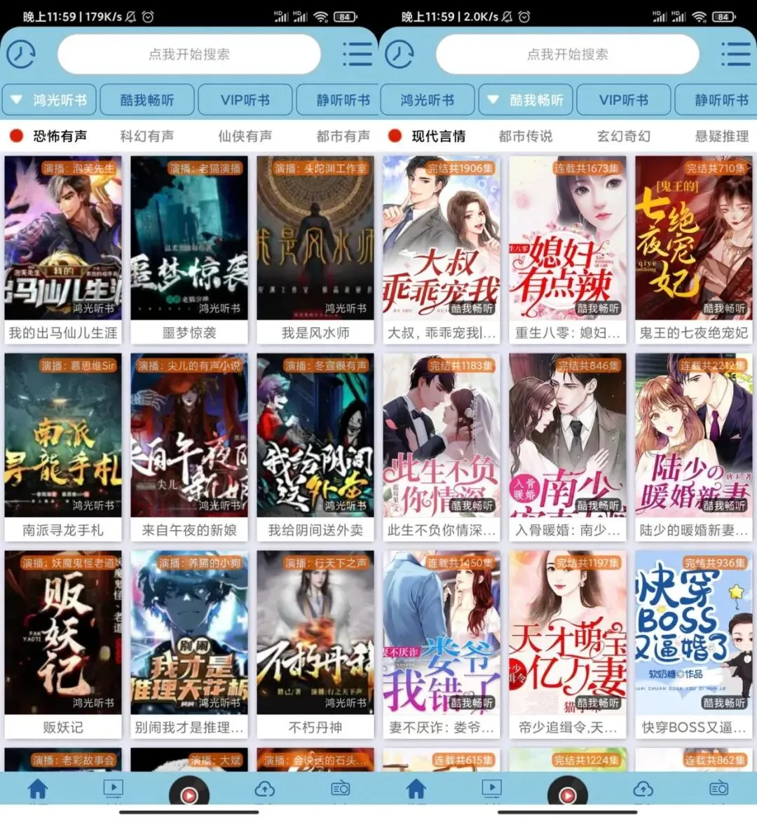 首页直接就是整合了全网非常多的资源平台的听书内容,包含各种类型的小说资源,可以随意收听。