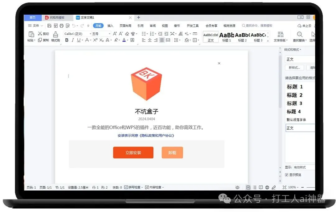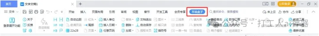 安装后可以在Word界面的顶部菜单栏看到“不坑盒子”的字样,如上图!里面含有丰富的快捷功能。尽管不坑盒子提供了许多免费功能,但也存在免费账号和会员账号在权限上的差异,例如自动排版、标题-正文、自动边距等功能在会员账号中有更多的权限。