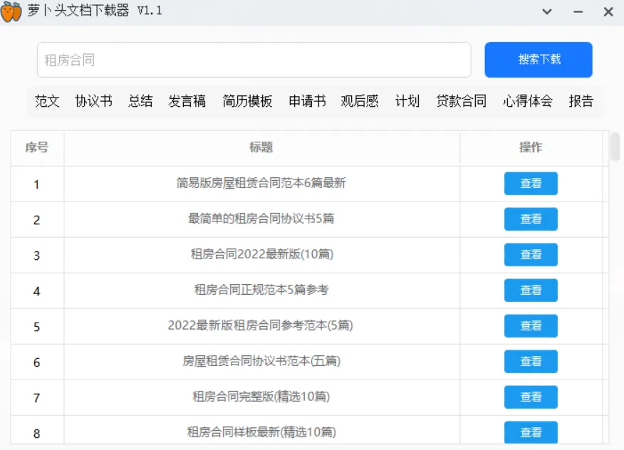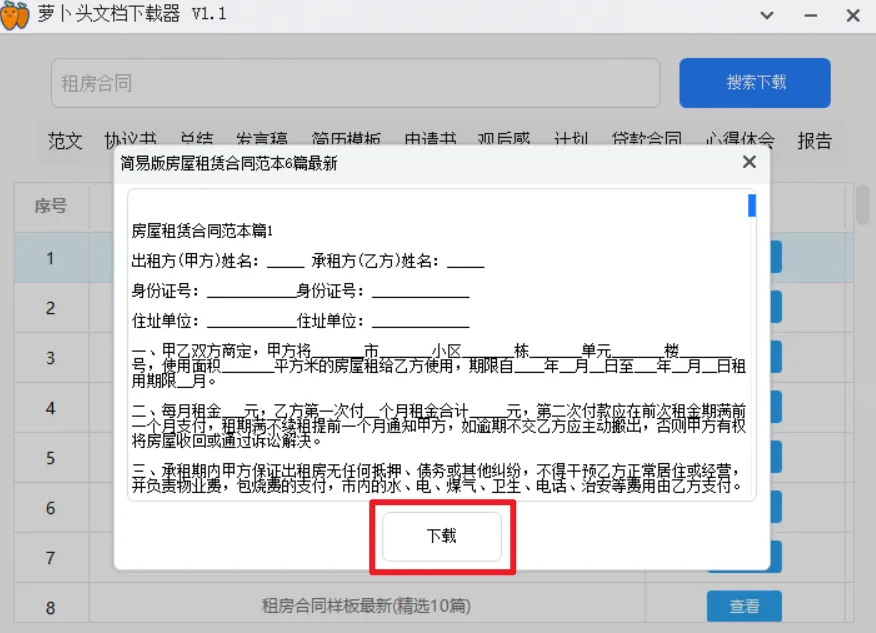 另外除了软件自带的分类,我们也可以自行输入想要搜索的文档,我搜索了一下租房合同,就出来好多文档,如下图所示: