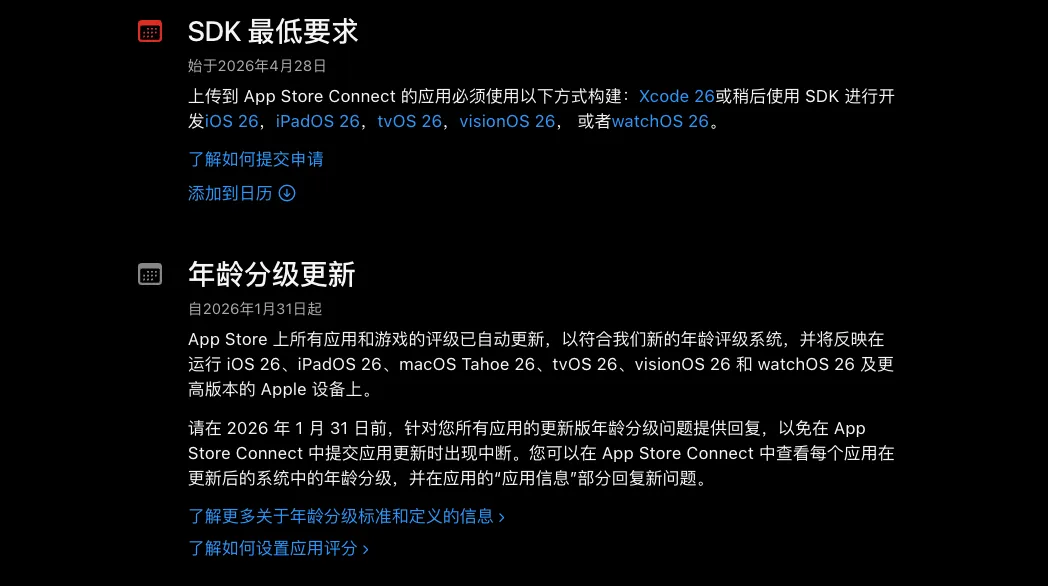 苹果“挟天子以令诸侯”,通过 App Store 来强行修正生态。根据苹果开发文档的最新要求,从 2026 年 4 月 28 日起。所有在 App Store 上架的应用、都必须用 iOS 26 的 SDK 来构建。